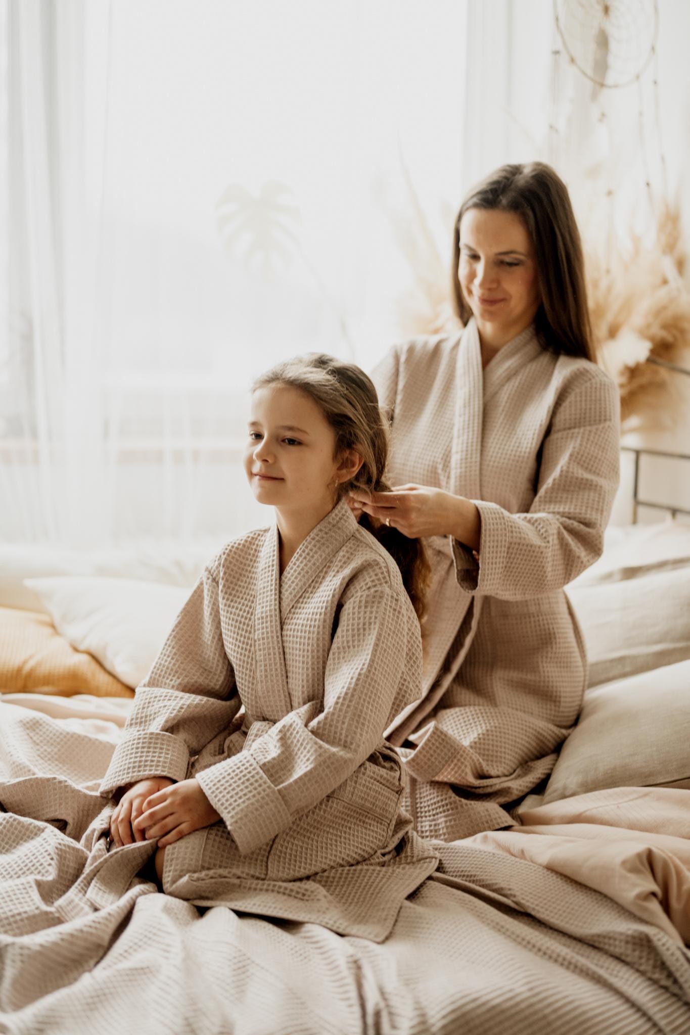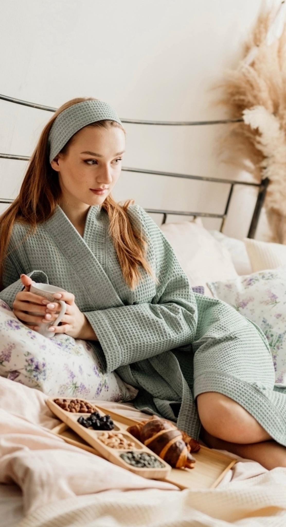 Woman´s exclusive bathrobe - Made of high quality european waffle cotton in colours Green melange or Beige melange.